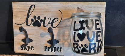 Hondenriem houder met haken en namen en een koekjes pot, want de hond moet toch beloond worden, nadat deze is uit geweest voor een plasje !